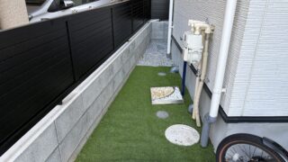 【人工芝敷設】人工芝を敷き詰め、重なり合う箇所は専用の接着剤で圧着します。外周と必要箇所にU字ピンで地面に固定します。